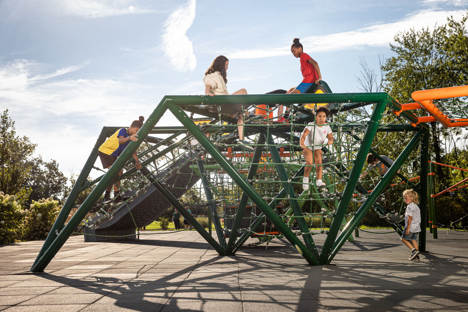 Get ready for PlayForm 7 - a revolutionary sculpture that combines art and play like never before! Lounge, swing, and conquer new challenges on treads, hammocks, slacklines, and slopes. Spark creativity and experience a unique play adventure. Say goodbye to boring playgrounds and hello to excitement at PlayForm 7!